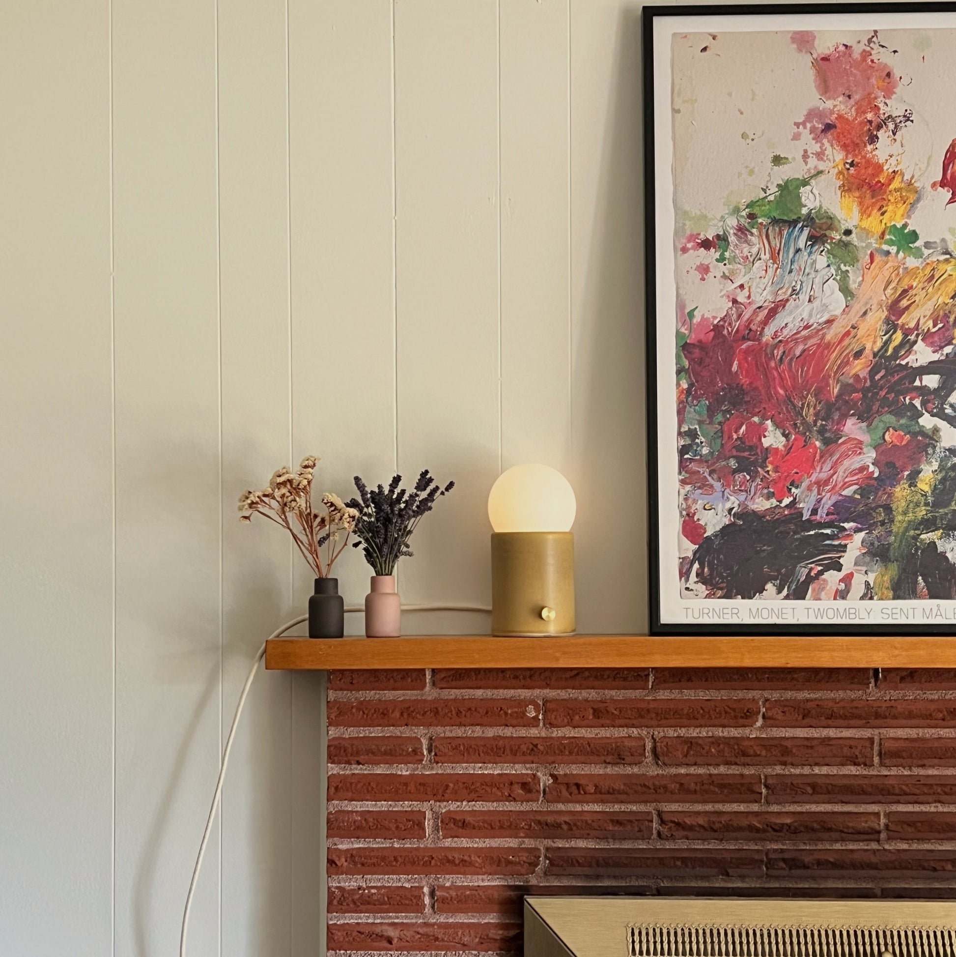 The Mini Pillar Lamp is our modern take on a living room essential. A large, dimmable LED globe bulb sits atop our hand thrown ceramic base. The Mini Pillar is about half as tall as our original Pillar Lamp - perfect for smaller spaces. Turn the brass knob to turn the lamp on/off and dim to your preference.